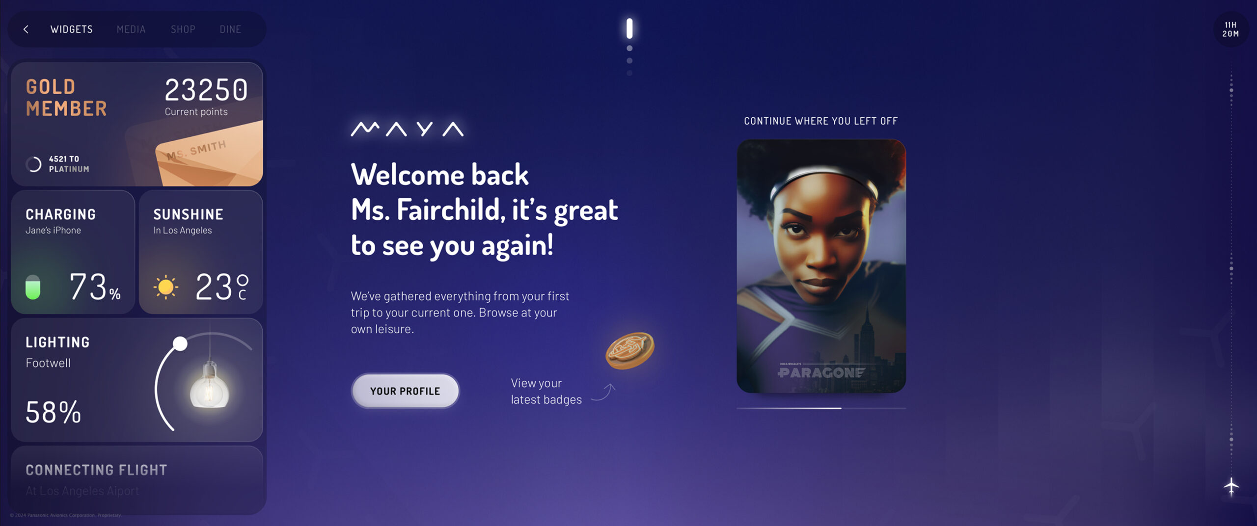At the same time, with all the available screen estate we had to make sure the user experience is not overwhelming. Our approach makes sure the center of the screen feels anchored and uncluttered for the user at all times. Users can discover additional contextual widgets near the edges of the screen, such as flight information through the Arc map, shopping, and other areas to explore.