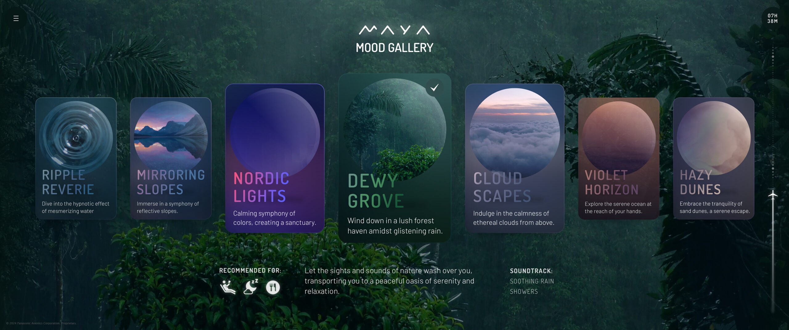 We created a unified digital experience that showcases all the elements of MAYA, which features a cohesive integration of Panasonic Avionics’ ultra-wide curved screen, touchpad-like “Active Surface” controls, personal device charging and identification as well as crew-facing screens.
